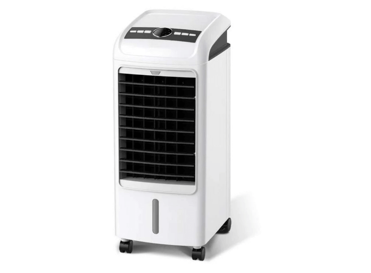 Este aire acondicionado portátil ventila, refresca, humidifica y purifica el aire, siendo ideal para estancias de hasta 15 m². Con un nivel sonoro máximo de 55 dB y una potencia de 65 W, este dispositivo cuenta con un visor frontal para el nivel de agua del depósito, el cual tiene una capacidad de 5 L y está dividido en dos: un depósito inferior extraíble y un depósito superior difusor, conectados entre sí y que mantienen un flujo de agua constante gracias a una bomba de 180 L/h, proporcionando una duración aproximada de 4 horas.