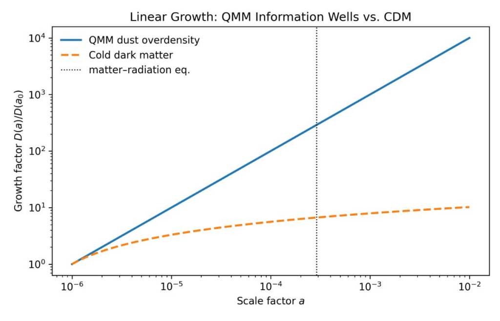 En condiciones adecuadas, estas fluctuaciones informacionales superan un umbral de densidad crítica (δ ≃ 0,3) y colapsan formando agujeros negros. Este mecanismo se describe como robusto y natural dentro del marco QMM. De hecho, los autores muestran que “las sobredensidades de información crecen linealmente con el factor de escala”, lo que significa que aumentan en intensidad al mismo ritmo que se expande el universo .