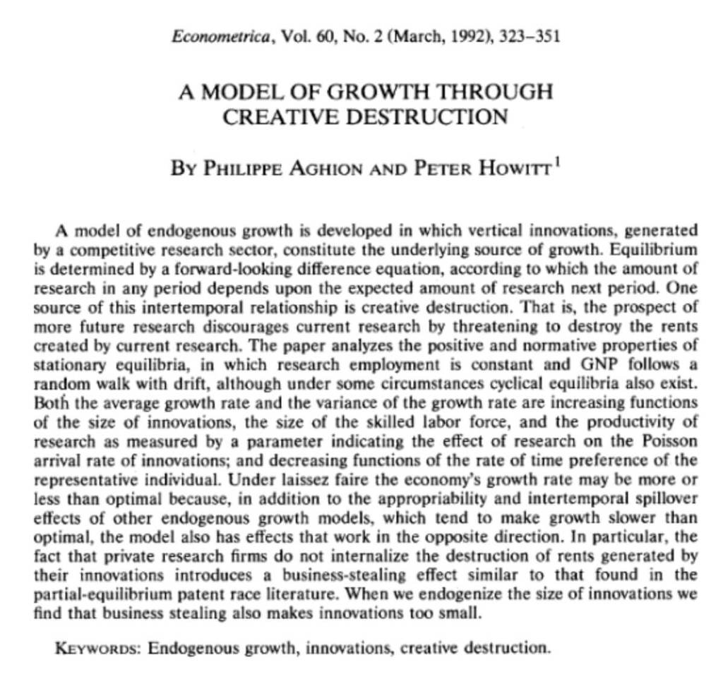 - Aghion, Philippe, and Peter Howitt. A Model of Growth through Creative Destruction. Econometrica, vol. 60, no. 2, March 1992, pp. 323–351. DOI: 10.2307/2951599.