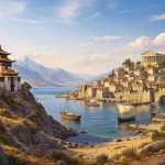 monasterio tibetano frente a un puerto griego clásico, dos mundos separados por la geografía pero unidos por la búsqueda del sentido
