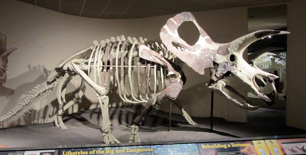 Una vez que se pasa primera impresión lógica al presenciar el fósil de un dinosaurio con poderosos cuernos, uno puede fijarse en otros detalles del esqueleto. Por ejemplo, observando con detalle un espécimen de Torosaurus, no sería en absoluto extraño caer en la cuenta de una característica bien visible: ¡menudo cabezón! Y no sería un comentario baladí, pues estamos ante el cráneo más grande de todos los animales terrestres conocidos en la historia del planeta Tierra, quizás solo disputado por Pentaceratops, un familiar cercano en la línea evolutiva.