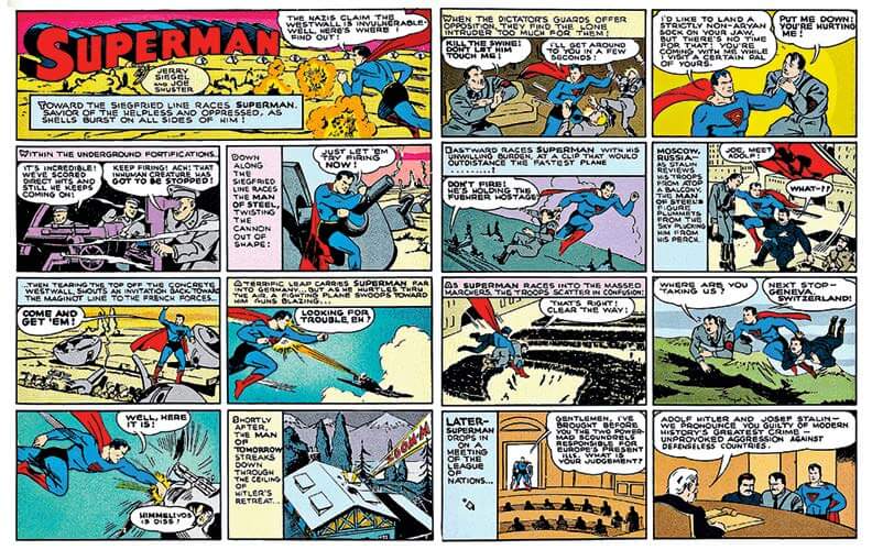 El 27 de febrero de 1940 se publica en la revista Look una curiosa aventura titulada “Cómo terminaría Superman la guerra”, en la que el kryptoniano vuela hasta Berlín y Moscú y, agarrando a Hitler y Stalin por la pechera del uniforme, surca los cielos hasta la sede de la Sociedad de Naciones en Ginebra, donde los deposita para ser juzgados.
