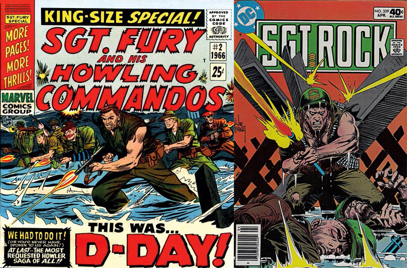 Así, por ejemplo, Marvel creó la colección bélica Sgt. Fury y sus comandos aulladores (1963), en cuyo número 2 se narra la participación de este grupo del Ejército en el desembarco de la playa de Omaha, y en el número 59 se retoma el tema focalizándolo en la mano derecha de Fury, su compañero de armas Dum-Dum. La editorial DC hizo lo propio y apostó por el género bélico con la colección Our Army at War (1959), protagonizada por el popular personaje del Sgt. Rock. Aunque su campo de operaciones habitual está en el frente italiano y el norte de África, hay una aventura titulada “I was here before!” (1980) en la que se le traslada para que participe en el desembarco de Normandía.