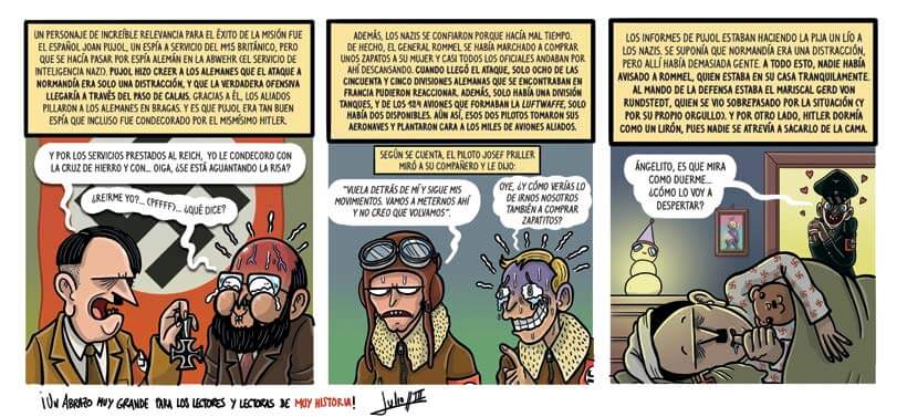 Quien quiera acercarse a este tema en lengua castellana puede recurrir a las páginas de Don Julio sobre el Día D en la serie Deshechos históricos (2020). Con mucho sentido del humor, pero partiendo en una excelente labor de documentación, analiza la recepción de la noticia del desembarco por el alto mando alemán, ocupándose incluso del papel jugado por el doble espía español Joan Pujol, que consigue hacer creer a los nazis que el ataque a Normandía es solo una distracción de la verdadera ofensiva que llegaría poco después a través del estrecho de Calais.