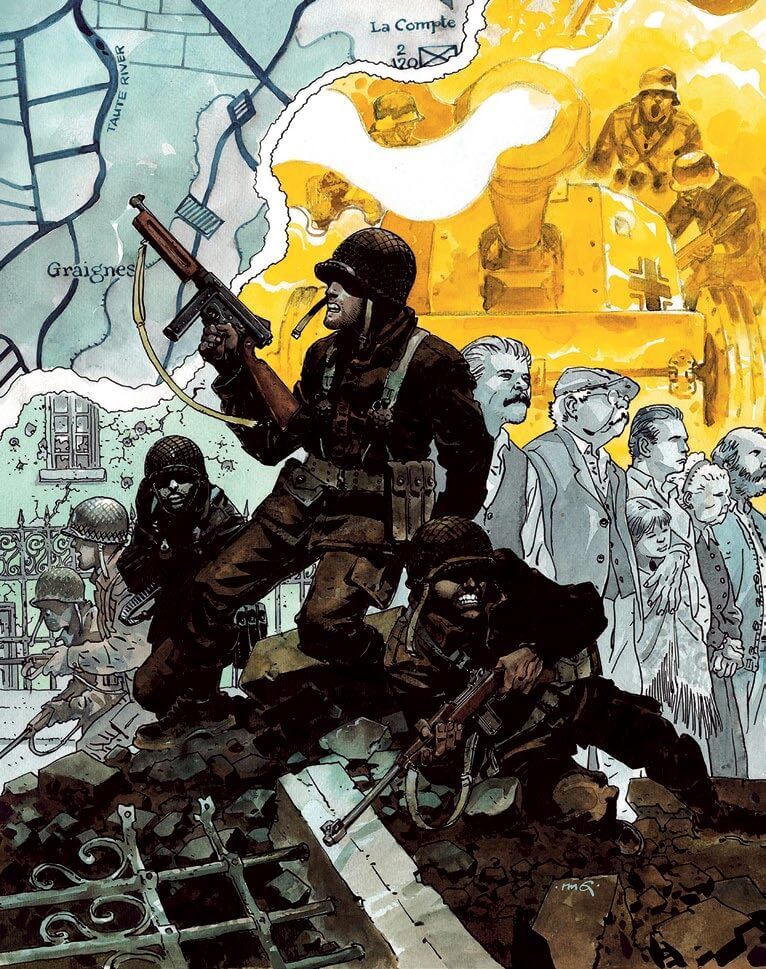 El modo más sencillo de lograr este doble objetivo consistió en realizar una profunda revisión, aunque bien se podría decir un proceso de mitificación e idealización, en torno a la Segunda Guerra Mundial, en general, y al Día D, en particular. De este modo, la contienda se convirtió en la última guerra justa y noble. Así, por pura comparación, el cómic puede permitirse mostrar las guerras posteriores, como las ocurridas en Corea o Vietnam, con un espíritu más crítico y mucho menos maniqueo.
