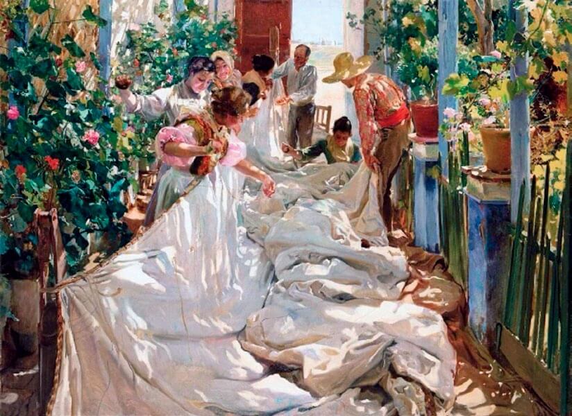 Pero si había una ciudad icónica para Sorolla, esta era París. Desde mediados del siglo XVIII, la capital francesa se había convertido en el centro del mercado del arte europeo y hospedaba anualmente el Salón de París, una enorme exposición que galardonaba a artistas locales y extranjeros, pero que también funcionaba como lugar de encuentro para pintores y mecenas. En 1897, Sorolla obtuvo un gran éxito en el Salón con su enorme lienzo Cosiendo la vela, una impactante pieza que demostraba que los blancos, tal y como afirmaba el pintor, nunca son iguales y nunca son puramente blancos. Siete años más tarde, presentó este mismo cuadro en otra gran exposición, la Bienal de Venecia, donde su éxito fue tal que el ayuntamiento veneciano acabó adquiriendo la obra.