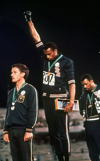Allí, los atletas estadounidenses de raza negra Tommie Smith y John Carlos lograron las medallas de oro y bronce, respectivamente, en la prueba de los 200 metros. Al escuchar desde el podio su himno nacional, agacharon la cabeza y levantaron el puño, enfundado en un guante negro. Smith alzó el derecho, representando el “Black Power”, y Carlos, el izquierdo, en homenaje a la “Unidad Negra”. De esta forma, ambos puños pretendían formar “un arco de unidad y poder”. Además, habían subido al podio sin zapatos y con calcetines negros, para simbolizar la pobreza de su raza. Smith llevaba un pañuelo negro al cuello, mientras que Carlos portaba un collar de abalorios cuyas cuentas representaban, según dijo, a las personas linchadas o asesinadas.